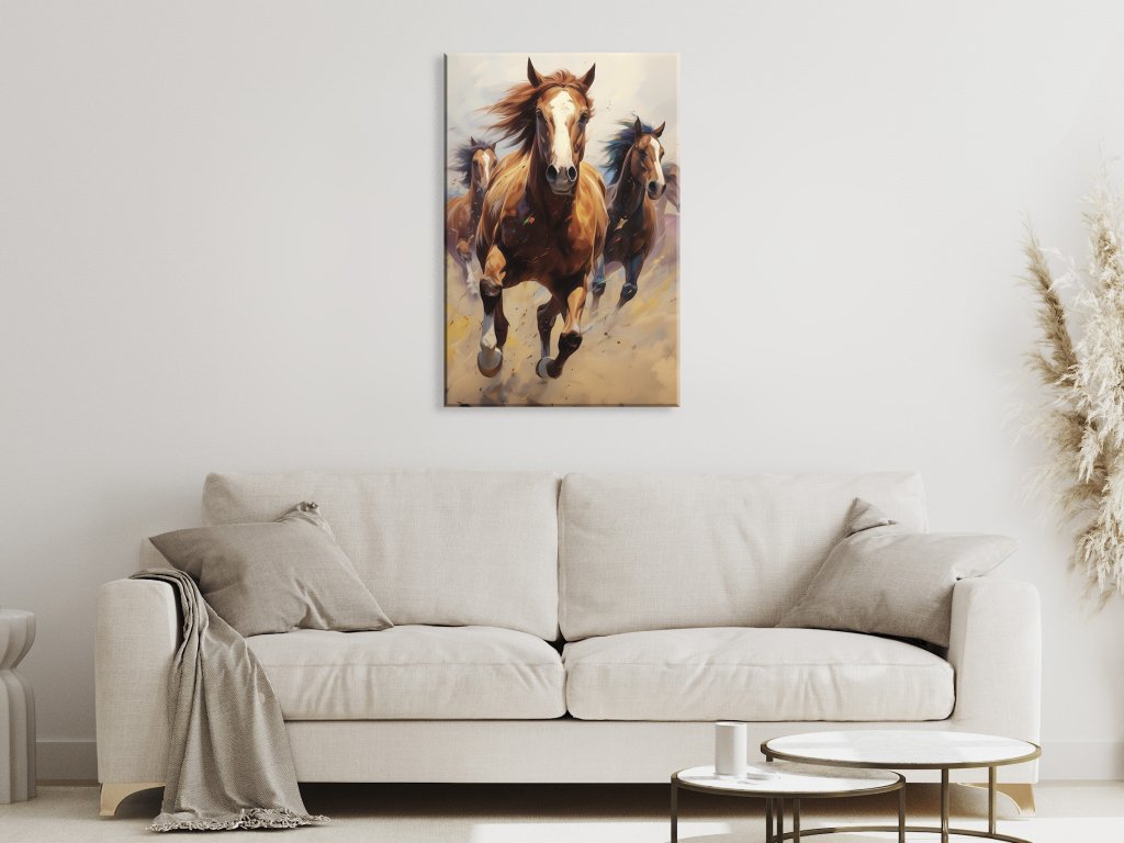 Tento obraz zobrazuje tri kone v plnom cvale, pričom ich svaly a hrivy sú zvýraznené v pohybe. Kone sú zachytené z predného pohľadu, čo dodáva dielu dynamiku a energiu. Farby a detaily na obraze vytvárajú realistický a živý dojem, ktorý umocňuje pocit rýchlosti a slobody.