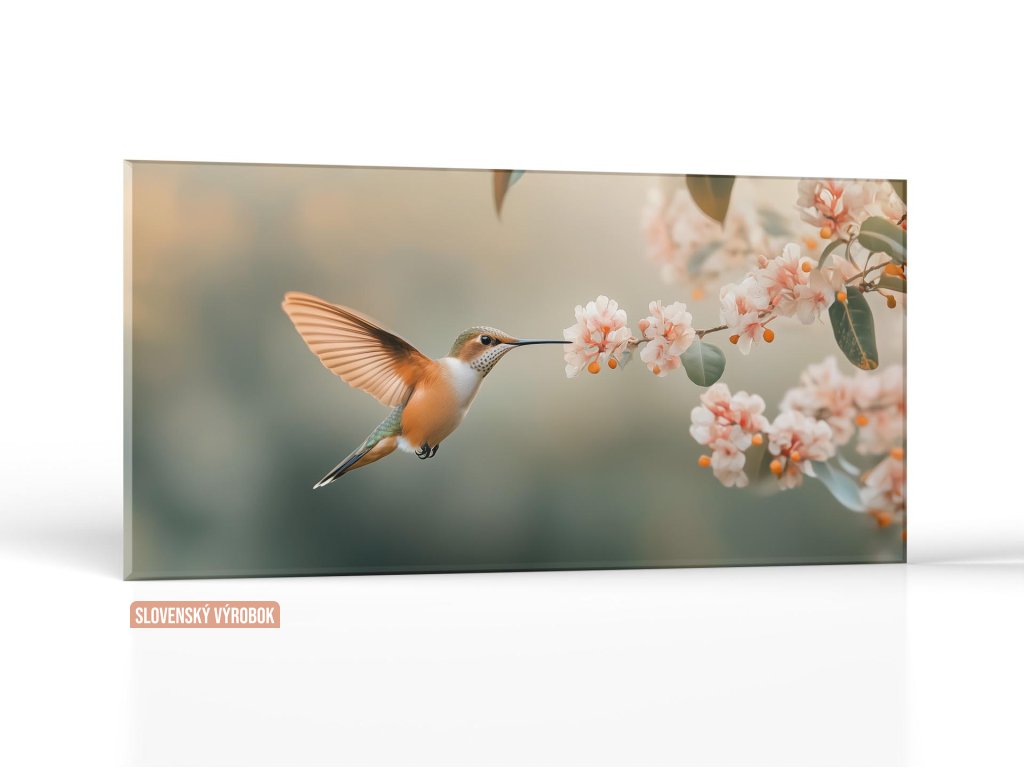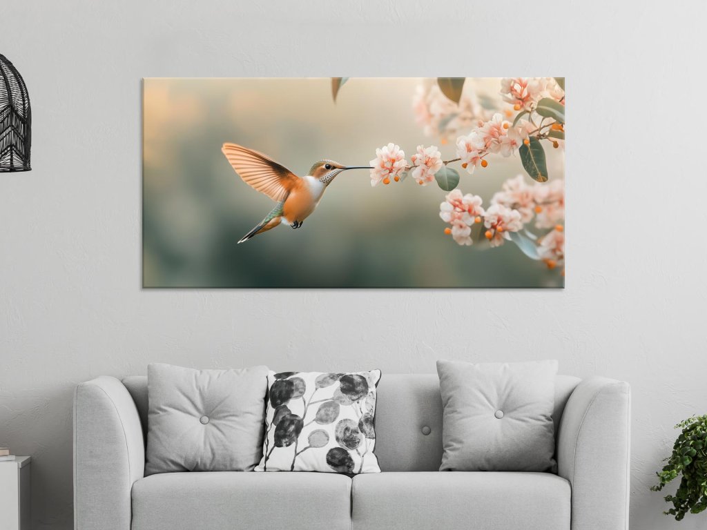Obraz zachytáva magickú chvíľu, keď sa kolibrík vznáša pred vetvou plnou rozkvitnutých kvetov a jemne sa dotýka ich nektáru. Jemné svetlo a mäkké pozadie zvýrazňujú kontrast medzi dynamikou vtáčieho letu a pokojom prírody. Celá scéna pôsobí ako zázrak okamihu — ľahká, harmonická a plná krehkej krásy života.