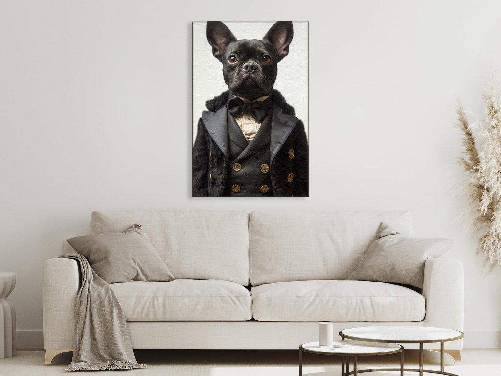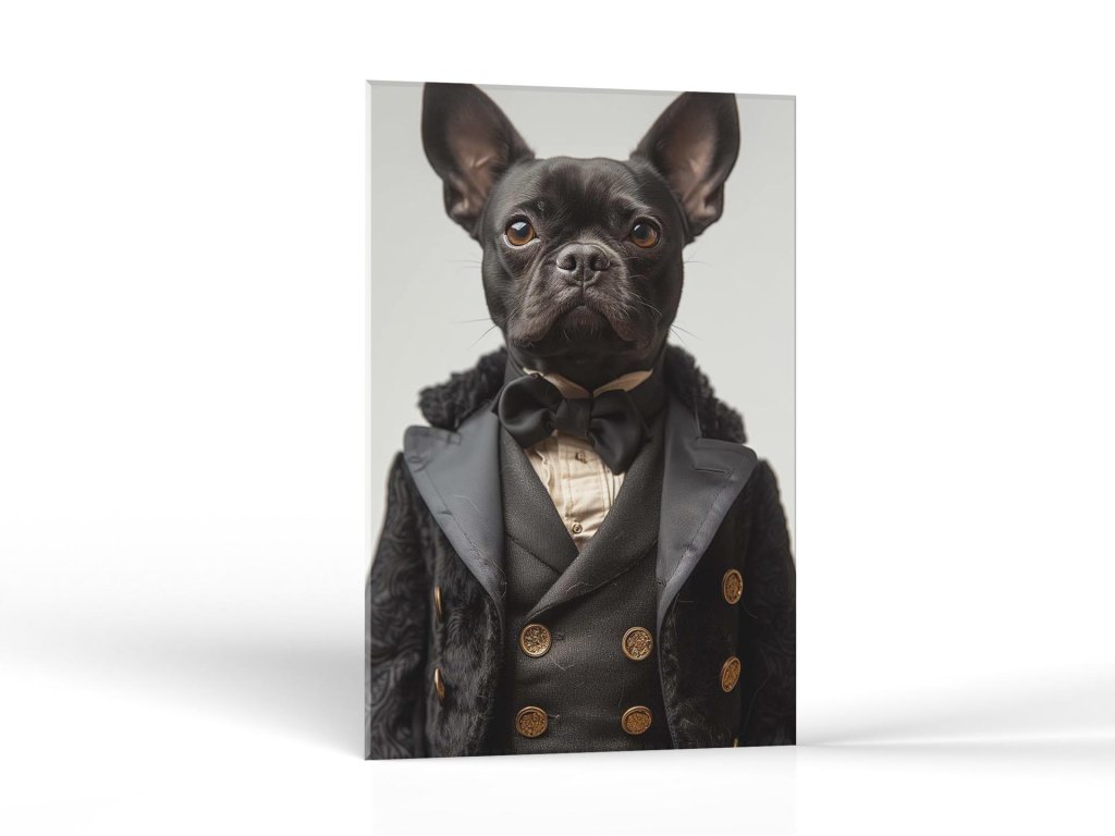 Na obrázku je zobrazený čierny pes plemena francúzsky buldoček, ktorý má na sebe elegantný oblek. Jeho zvedavý pohľad a čisté, lesklé oči sú zamerané priamo na diváka, čo vytvára intímnu a osobnú atmosféru. Pes má na sebe tmavý, pravdepodobne čierny kabát s textúrou, ktorý je zdobený zlatými gombíkmi a doplnený o bielu košeľu a čierny motýlik. Tento formálny výzor psa dodáva obrázku humorný a roztomilý nádych, zatiaľ čo tiež prezentuje nezvyčajný kontrast medzi zvieracou nevinnosťou a ľudským oblečením.