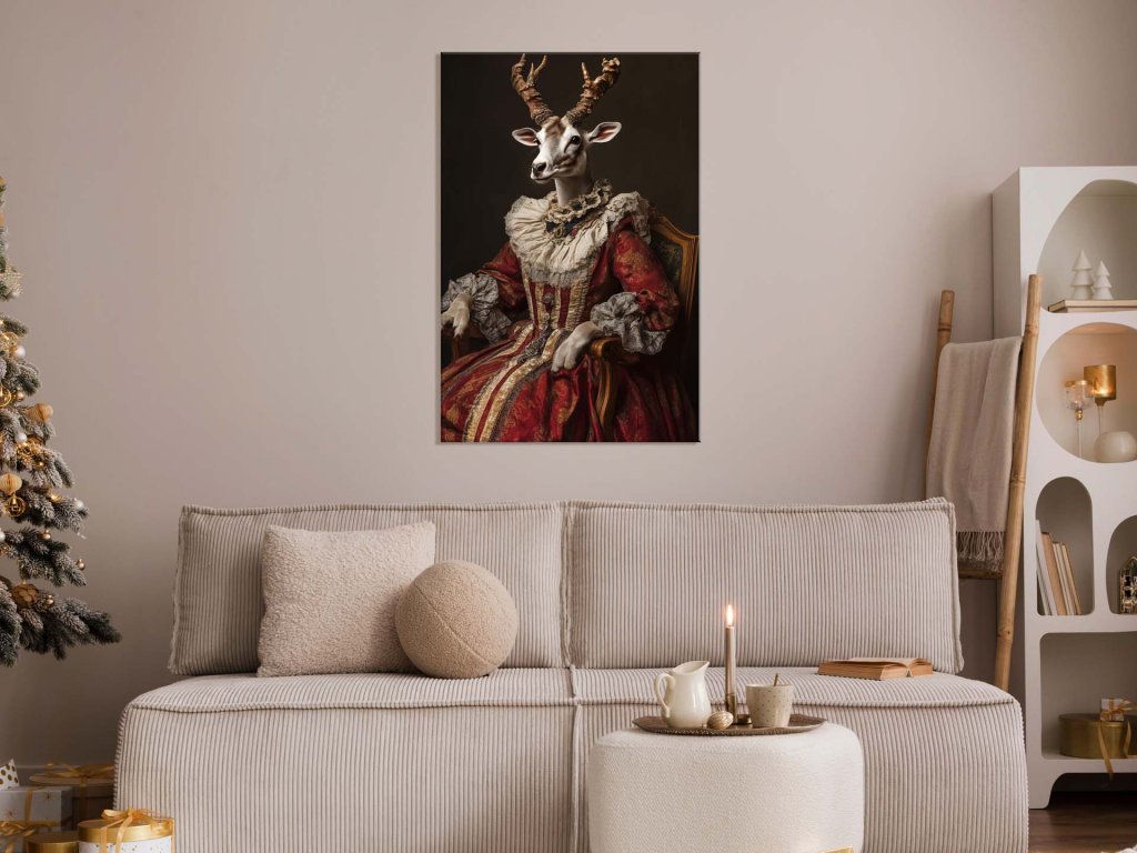 Tento obraz zobrazuje surrealistický portrét antilopy oblečenej do zložitej, čipkovej róby pripomínajúcej šľachtické odevy z minulosti. Antilopa sedí na bohatom, vyrezávanom kresle a jej póza a výraz vyžarujú dôstojnosť a majestátnosť. Kontrast medzi divokým zvieraťom a luxusným, ľudským oblečením vytvára fascinujúci a snový výjav, ktorý upúta svojou nevšednou atmosférou.