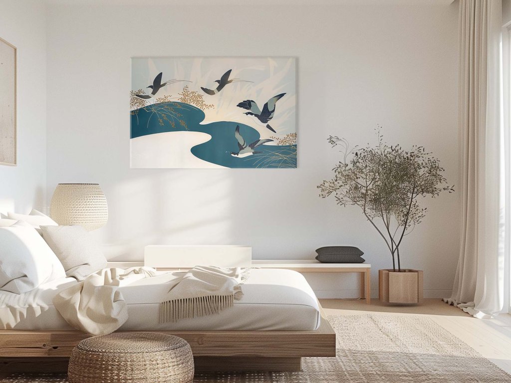 Tento obraz zobrazuje elegantný let vtákov nad pokojnou vodnou plochou. Jemné a plynulé línie vtákov vytvárajú dojem pohybu a voľnosti, zatiaľ čo pozadie pozostáva z mäkkých, prírodných farieb. Celková kompozícia pôsobí pokojne a harmonicky, čím evokuje pocit slobody a spojenia s prírodou.
