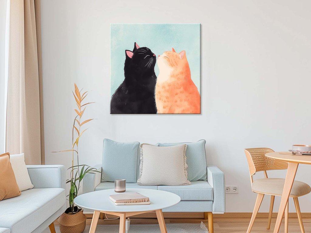Tento obraz zobrazuje jemný a láskyplný moment medzi dvoma mačkami, jednou čiernou a druhou ryšavou. Mačky majú privreté oči a pôsobia pokojne, čo naznačuje dôveru a harmóniu medzi nimi. Táto scéna zachytáva okamih nežnosti, ktorý vystihuje hlboké puto medzi zvieratami, plné úprimnej lásky a porozumenia.