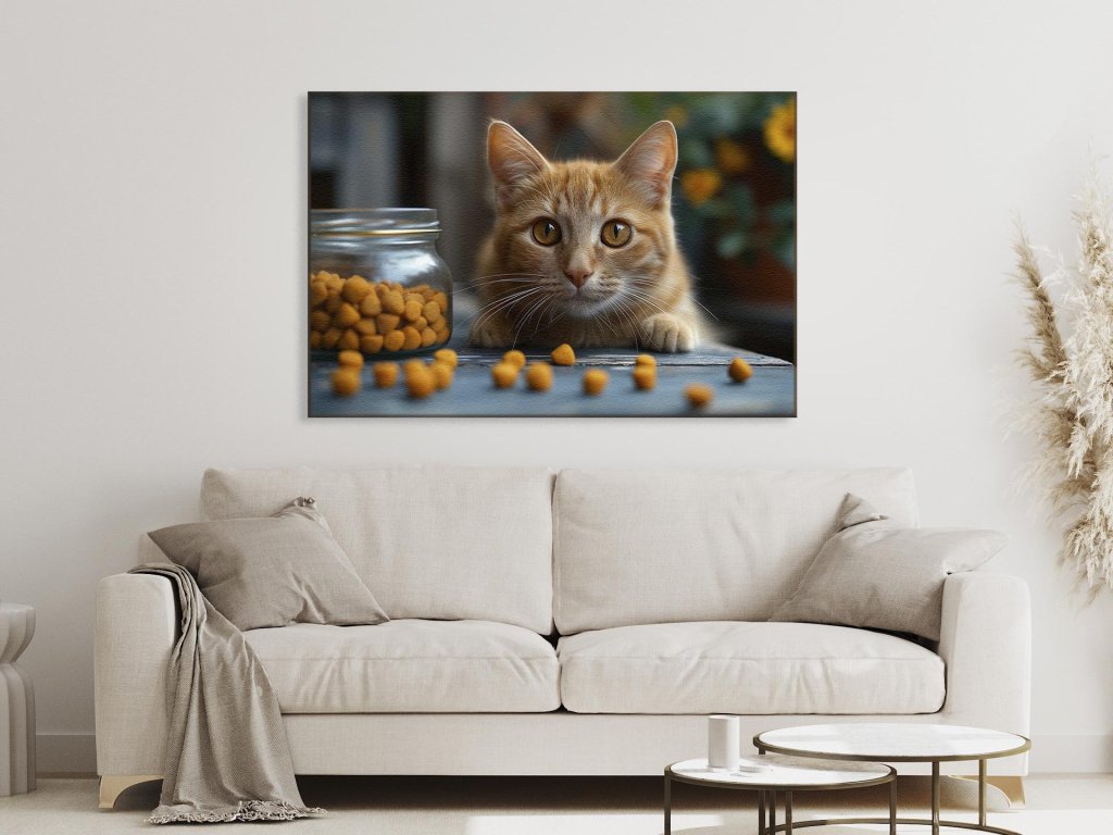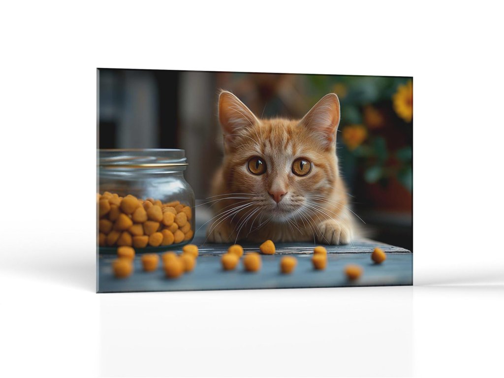 Očarujúci portrét mladej mačky s medeným kožúškom, ktorá so zvedavosťou a možno aj malým vzrušením sleduje sklenenú nádobu naplnenú mačacími pochúťkami. Jej jasný pohľad a drobné, ostré ťahy vibrísov naznačujú, že je pripravená na malý maškrtný rituál. Okolo sú rozsypané pochúťky, ktoré možno už čoskoro potešia jej chuťové bunky. Pozadie je jednoduché, s jemnými náznakmi zelenej rastliny, ktorá pridáva k scéne pôvab a pohodu. Na tomto obraze je zachytený pokojný, no zároveň napätý okamih, ktorý odhaľuje mačku v jej prirodzenom stave zvedavosti a očakávania.