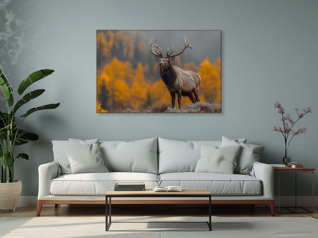Jeleň s impozantným parožím pózuje na pozadí jesenného lesa, ktorý sa pýši žiarivou paletou oranžových odtieňov. Hmla dodáva obrazu tajomnú atmosféru. Toto živé zobrazenie divočiny vyzdvihuje krásu prírody a divokého života v nej.