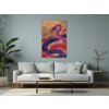 Na obraze sú tri hady prepletené v zložitom vzore na pozadí zdobenom jemnými zlatistými motívmi. Hady majú rôzne farby, vrátane odtieňov purpurovej, červenej a modrej, a každý z nich má výraznú šupinatú textúru. Dynamika a elegancia hadov kontrastuje s pokojným a rytmickým pozadím, čo vytvára pocit hĺbky a textúry.