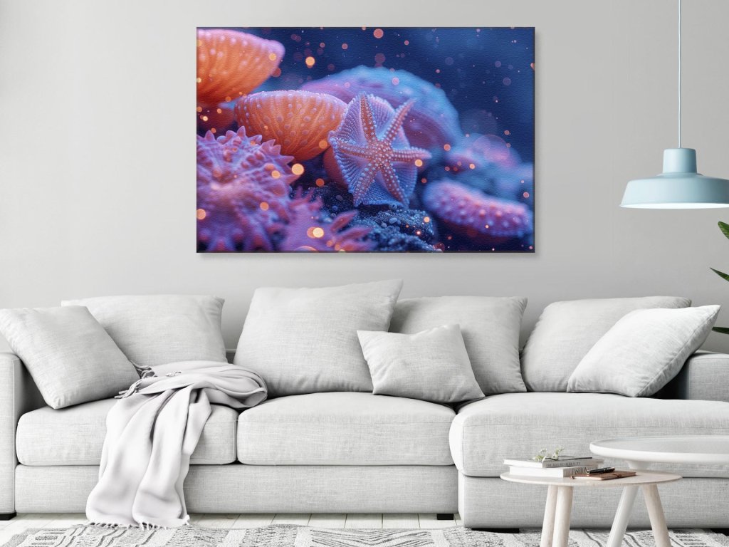 Obraz zobrazuje modrú hviezdicovku s bielymi bodkami, ktorá je umiestnená na sýto ružových a oranžových koraloch. Koraly majú jemné textúry a sú zaliaté bielymi bublinkami, ktoré pridávajú hĺbku a zvýrazňujú detaily. V pozadí obrazu je tmavomodrá voda osvetlená teplými svetelnými bodkami, čo vytvára mystickú a pokojnú atmosféru.