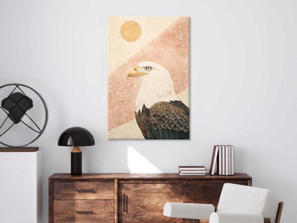 Tento obraz zachytáva majestátneho orla, symbol sily a slobody, ktorý upiera svoj ostrý pohľad vpred. Jeho perie je precízne vyobrazené s dôrazom na textúru a prirodzený farebný prechod. Pozadie tvorí jemná geometrická kompozícia s pastelovými tónmi a zlatistým slnkom, ktorá kontrastuje s dynamikou zvieraťa a umocňuje dojem vznešenosti.