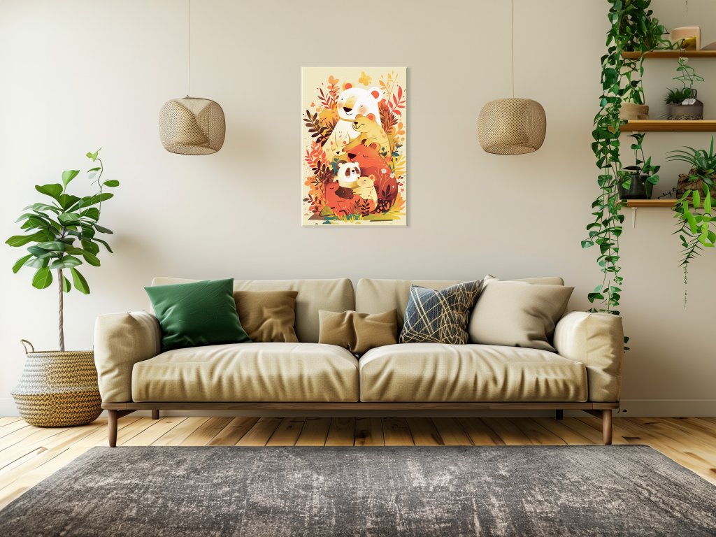 Na obraze je zobrazená skupina medveďov, ako spolu odpočívajú a vychutnávajú si spoločnosť v krásnom jesennom prostredí. Obraz je plný teplých jesenných farieb, ktoré vytvárajú pocit útulnosti a rodinnej pohody. Každý medveď je zobrazený s úsmevom, čo zdôrazňuje harmonickú atmosféru a radosť z blízkosti svojich blízkych.