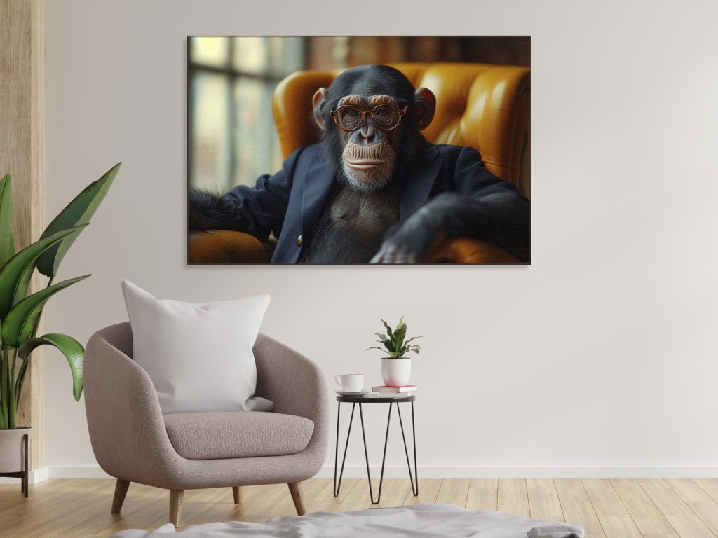 Na obrázku je šimpanz, ktorý sedí pohodlne v koženom kresle. Má na sebe tmavomodrý oblek a okuliare s okrúhlymi, zlatými rámovkami, ktoré dodávajú dojmu intelektuálneho vzhľadu. Jeho pohľad smeruje bokom, mimo záber, čo vyvoláva dojem, že je zahĺbený v myšlienky. Atmosféra obrázku je vážna a premyslená, a v kombinácii s tmavým pozadím a teplým osvetlením vytvára sofistikovaný portrét, ktorý by sme obvykle očakávali od ľudského subjektu. Tento kreatívny zobrazenie šimpanza v ľudskej pozícii pripomína, že hranice medzi ľudskou a zvieracou inteligenciou sú možno bližšie, ako si myslíme.