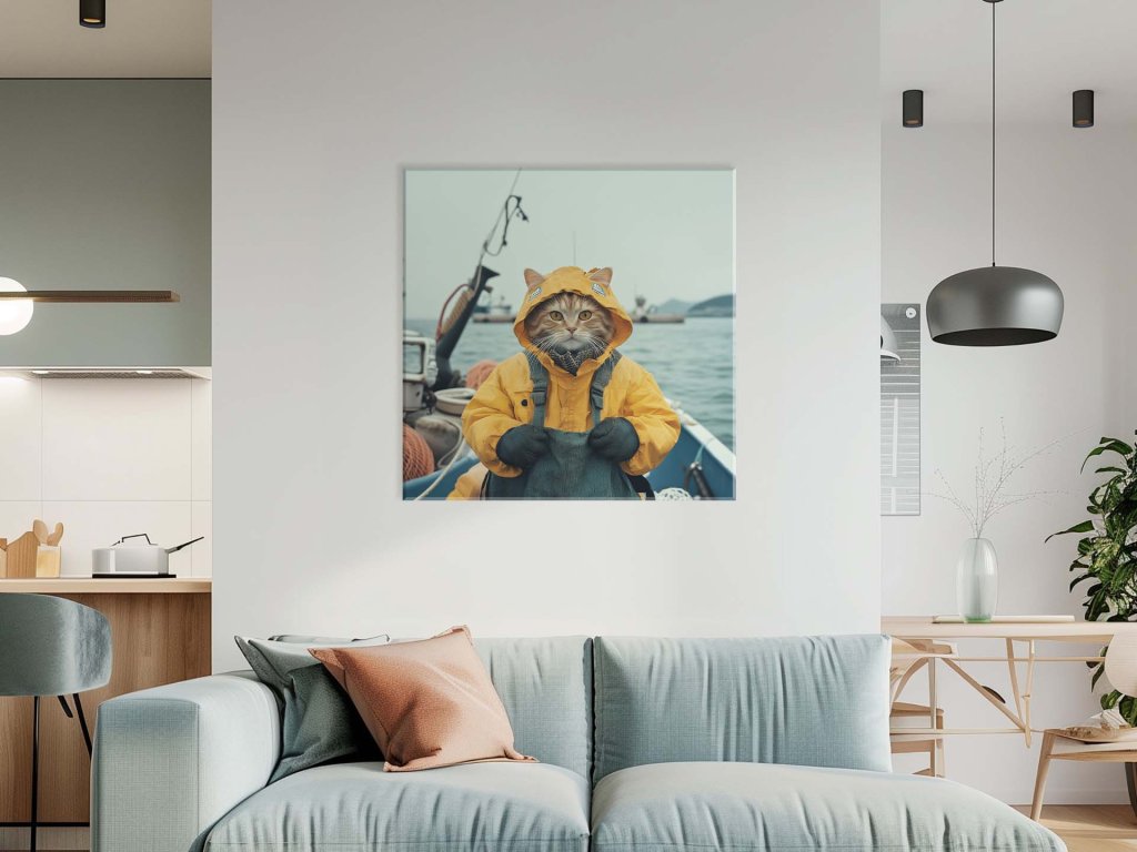 Tento obraz zobrazuje mačku v tradičnom žltom rybárskom oblečení, ktorá sa nachádza na lodi, uprostred mora. Jej ostražitý pohľad a odhodlaný výraz naznačujú, že je pripravená čeliť výzvam, ktoré prichádzajú s prácou na mori. Táto kompozícia spája humor so silným nádychom dobrodružstva, čím vyvoláva pocit pokoja a spojenia s prírodou.