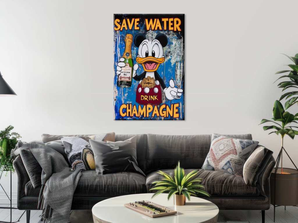 Obraz zobrazuje kreslenú postavu s fľašou šampanského a pohárom v ruke, pričom celý vizuál nesie veselú správu „Save Water, Drink Champagne.“ V kombinácii s výraznými farbami, najmä modrým pozadím a žiarivou červenou na oblečení, pôsobí zábavne a povzbudzujúco.
