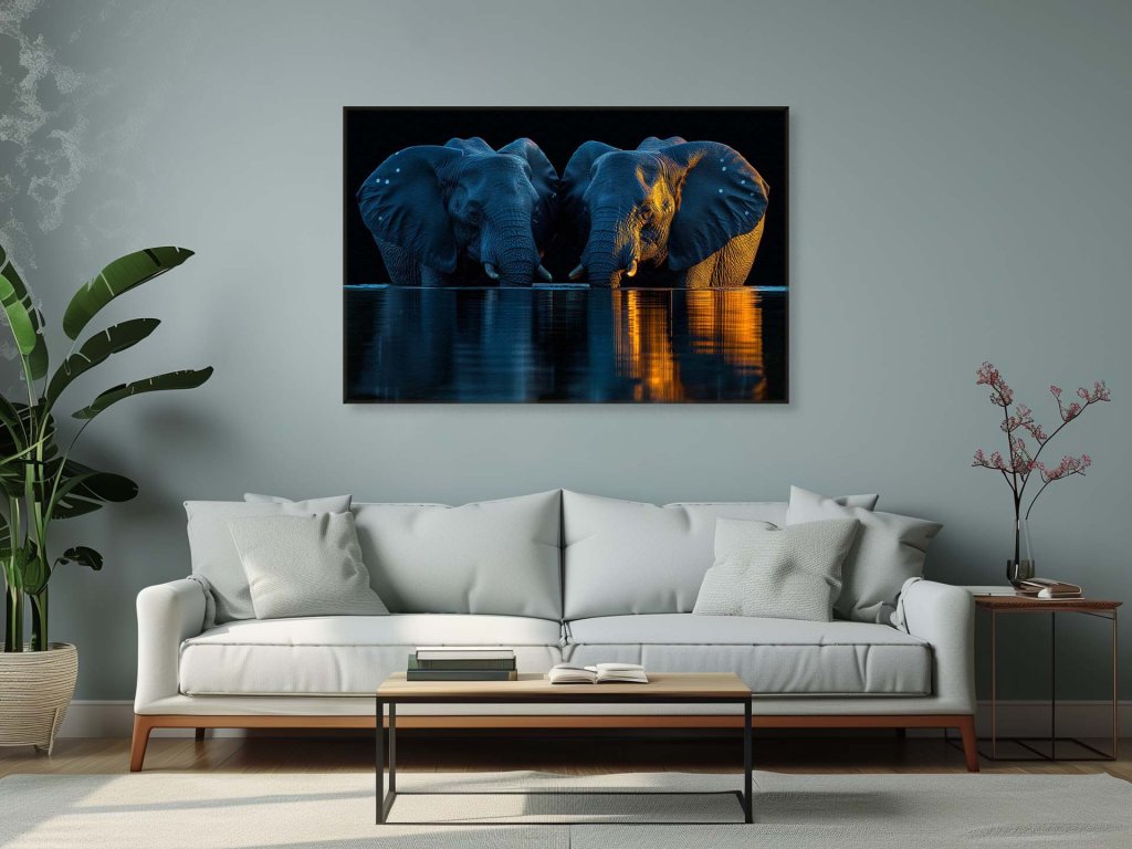 Dramatické osvetlenie zdôrazňuje dvojicu slonov, ktorí stoja bok po boku vo vode v nočnom svetle. Ich mohutné postavy sú zrkadlovo odrazené na vodnej hladine, čo vytvára dvojitý obraz symetrie a pokoja. Zlatisté odlesky na jednej strane kontrastujú s chladnými modrými tónmi, čo pridáva obrazu tajomnosť a eleganciu.