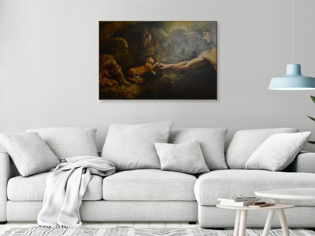Tento obraz kombinuje prvky renesančného umenia s moderným, hravým prístupom. Mužova ruka a mačkina labka sa takmer dotýkajú, čím evokujú ikonickú scénu zo stropu Sixtínskej kaplnky. Scéna je doplnená dramatickým osvetlením a kontrastom medzi temným pozadím a svetlými postavami, čo vytvára atmosféru tajomstva a posvätnosti.