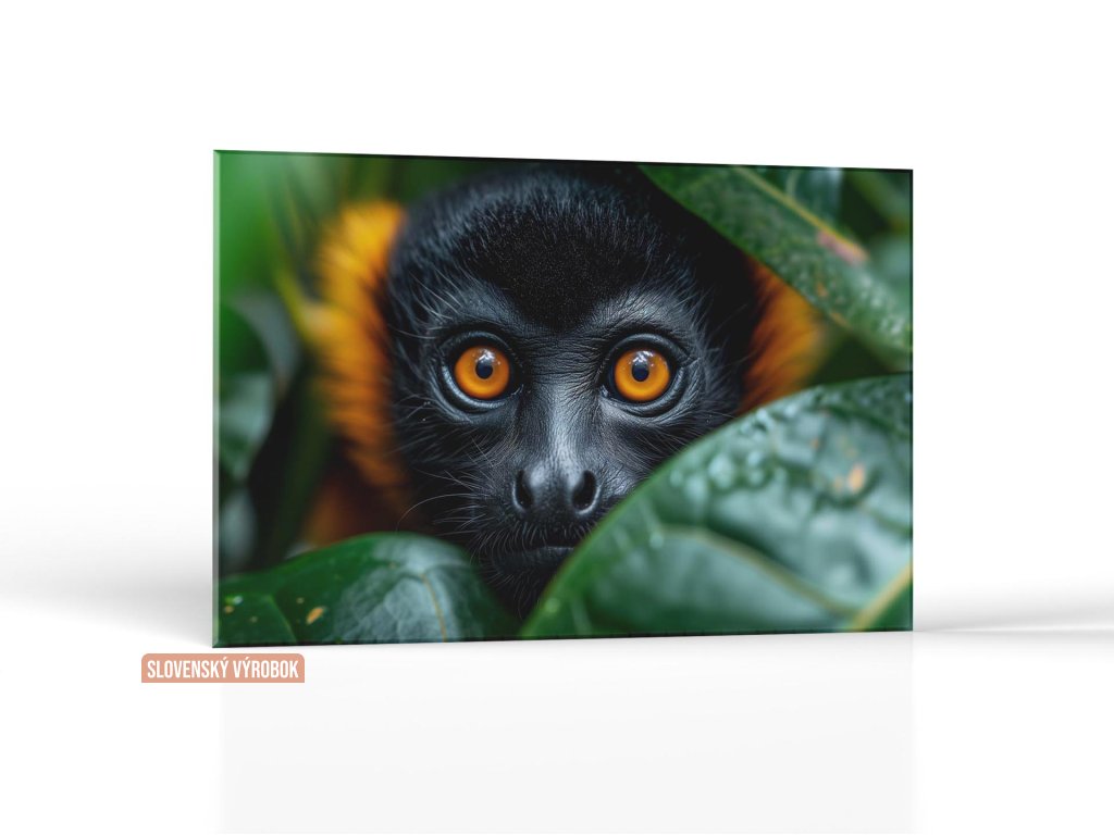 Zvedavý mladý primát s čiernou srsťou a výraznými oranžovými očami, ktorý sa díva priamo na diváka. Tvár je čiastočne zakrytá listami, ktoré poskytujú prirodzené maskovanie a zdôrazňujú jeho bdelé oči. Farebný kontrast medzi tmavou srsťou a žiarivými očami vytvára fascinujúci obraz.