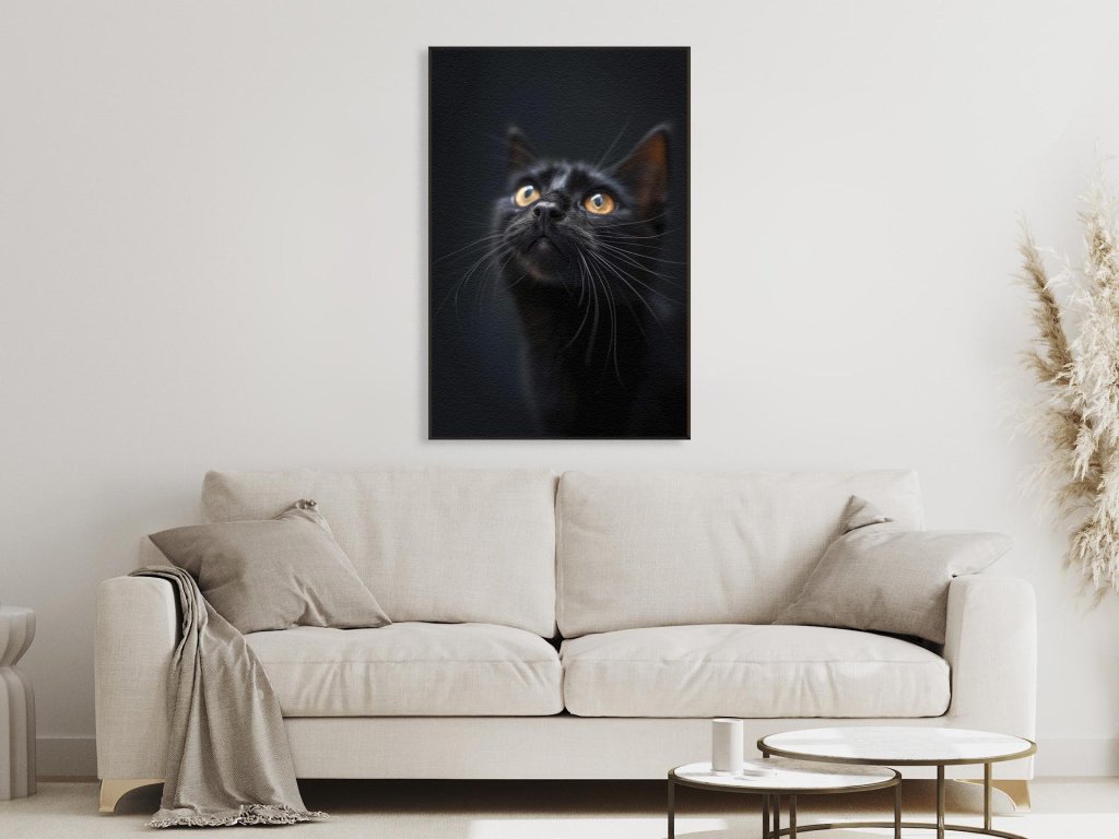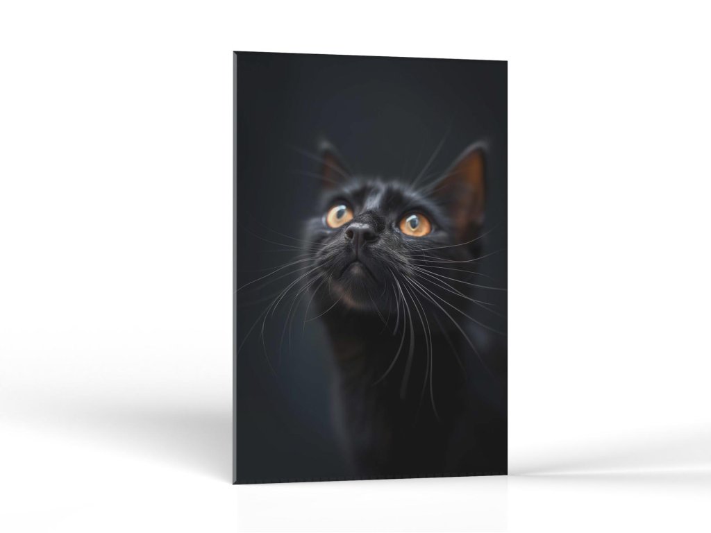 Na obrázku je zobrazená čierna mačka s hlbokými, žiariacimi oranžovými očami, ktoré sú výrazným prvkom na jej inak tmavom kožušine. Jej pohľad smeruje nahor, možno k neviditeľnému predmetu mimo snímky, čo dodáva fotografii pocit zvedavosti alebo ohromenia. Jemné detaily, ako sú biely chlp na brade a dlhé, tenké fúzy, vynikajú na tmavom pozadí, vďaka čomu portrét pôsobí mimoriadne živo a intenzívne. Hra svetla a tieňov na mačacej srsi vytvára zaujímavý kontrast a dodáva snímke hĺbku a textúru.
