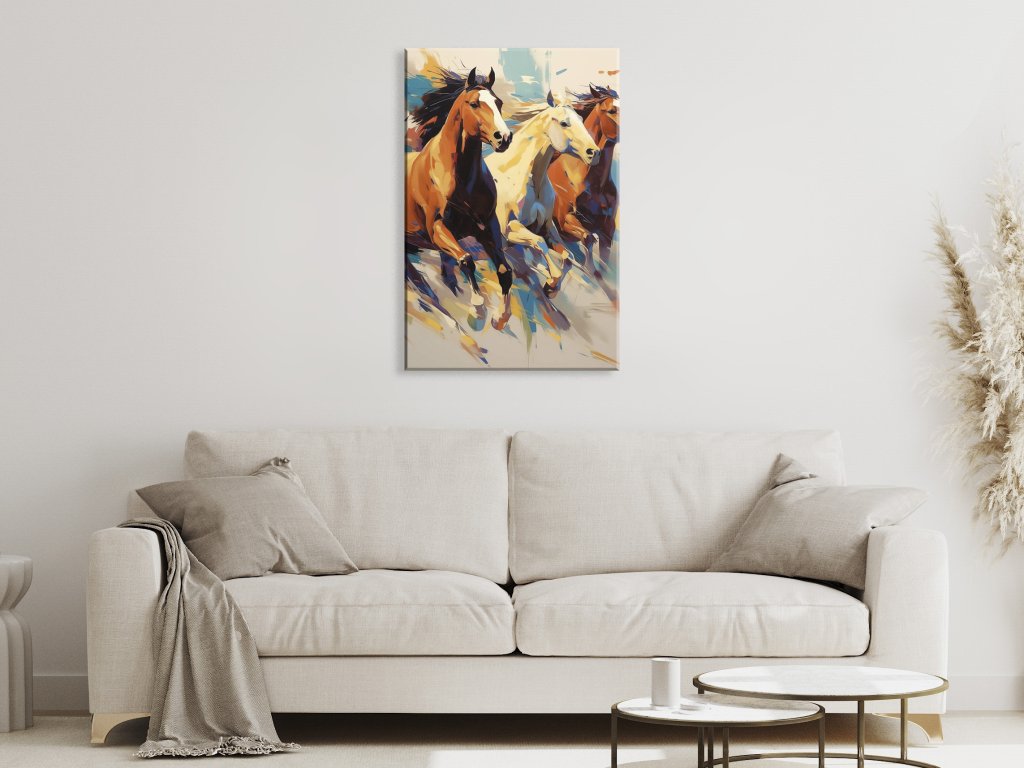 Tento dynamický obraz zobrazuje tri kone v plnom behu, každého v inej farebnej škále, čo vytvára živý a energický dojem. Kone sú zachytené v pohybe, s hrivami vejúcimi vo vetre, čo zvýrazňuje ich silu a eleganciu. Farby na obraze sú živé a kontrastné, čo pridáva obrazu na intenzite a umocňuje pocit rýchlosti a voľnosti.