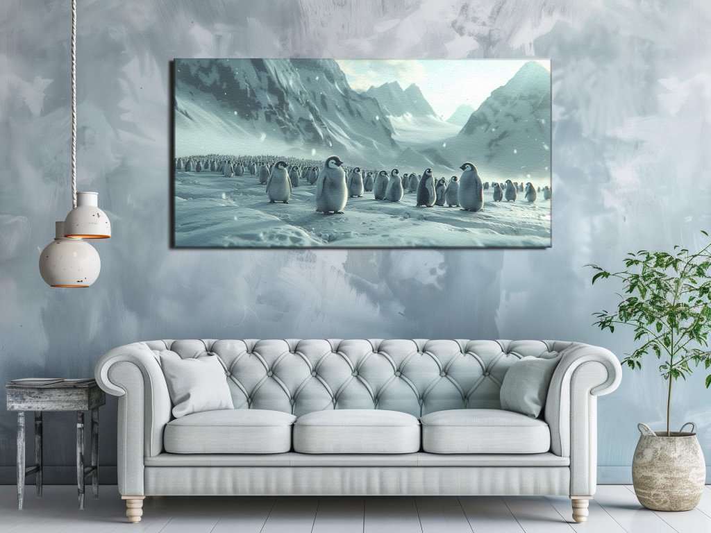 Skupina tučniakov stojí na zasneženom povrchu s výhľadom na dramatické horské útvary. Jemné snehové vločky padajú z oblohy, dodávajúc scéne pocit ticha a pokojnej izolácie. Tučniaky, oblečené v ich prirodzenom oblečení, tvoria kontrast proti monochromatickej bielo-sivej palete antarktickej krajiny.