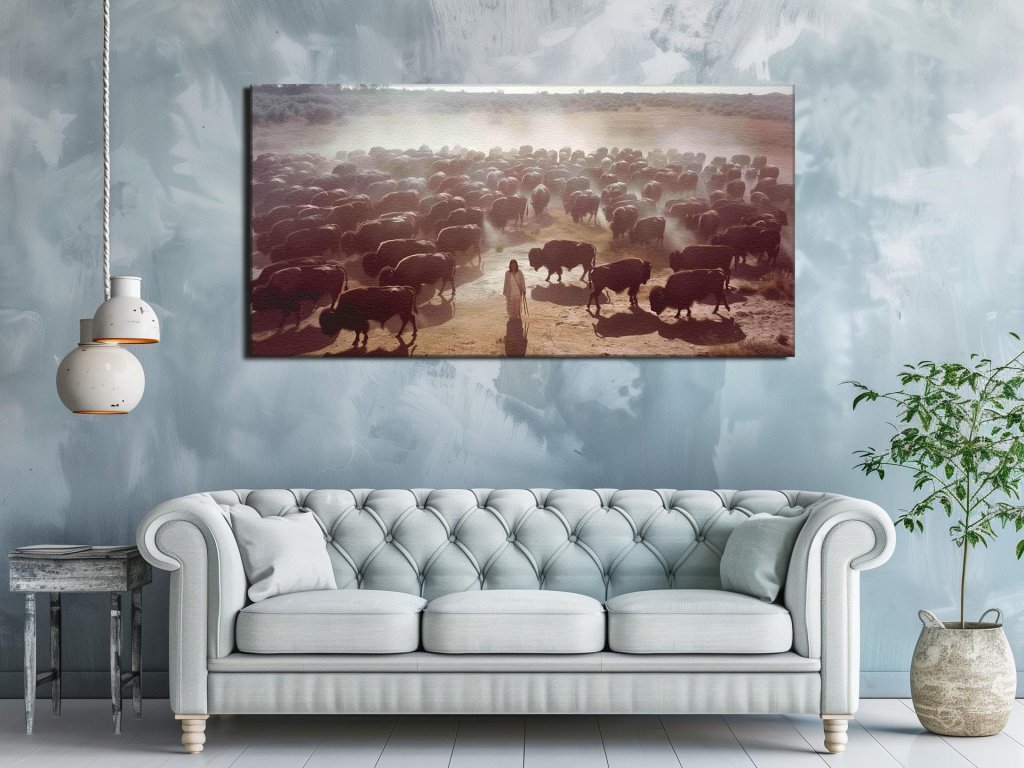 Osamotená postava stojí pokojne medzi dychtivo sa pohybujúcim stádom bizonov na prašnej savane. Priesvitné prachové mraky obklopujú zvieratá a dotvárajú pocit divokého pohybu, zatiaľ čo jemné slnečné svetlo preniká atmosférou a kreslí dlhé tiene. Tento obraz vytvára dojem odvážnej symbiózy a pokojnej koexistencie človeka s prírodou.