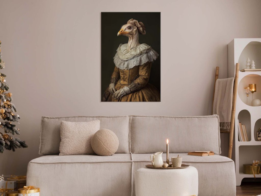 Tento obraz zobrazuje vtáka oblečeného v detailných historických šatách, ktoré zdôrazňujú eleganciu a vznešenosť. Bohaté zdobenie na odeve a čipkovaný golier vytvárajú dojem aristokratickej postavy z inej éry. Spojenie zvieracích prvkov s formálnym odevom dodáva výjavu surrealistický a zároveň fascinujúci vzhľad.