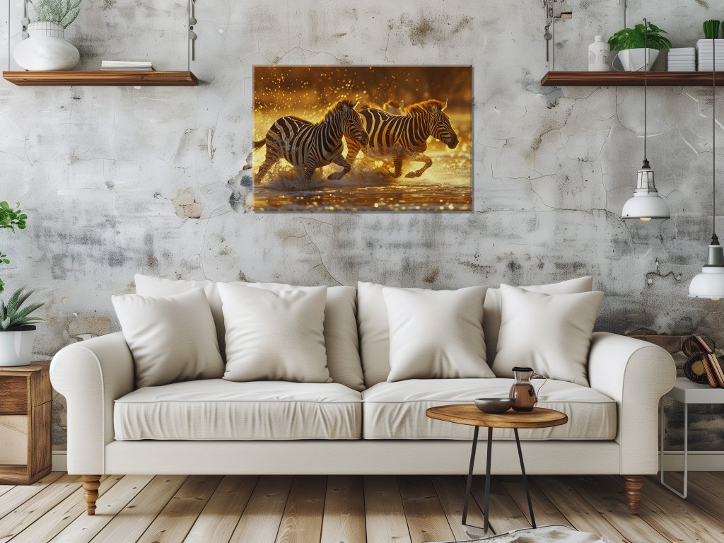 Tento obraz zachytáva dve zebry, ktoré s vervou prebiehajú cez vodnú plochu počas nádherného západu slnka. Zlaté svetlo slnka zvýrazňuje ich pruhy a vytvára oslnivý efekt, keď voda špliecha okolo nich. Scéna vyžaruje dynamiku a slobodu prírody v jej najčistejšej podobe.