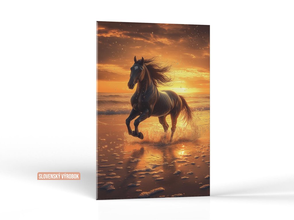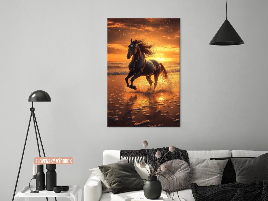 Obraz zachytáva čierneho koňa v pohybe, ako s divokou eleganciou cvalom prekonáva plytkú vodu pri západe slnka. Zlato-oranžové svetlo sa odráža od hladiny mora aj od lesklej srsti zvieraťa, čím vytvára takmer mystickú atmosféru. Kvapky vody a penové vlny dodávajú scéne dynamiku a živelnosť, zatiaľ čo dramatické nebo umocňuje silu okamihu.